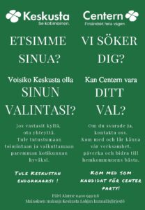 Jos haluat liittyä joukkoomme ja asettua ehdolle ensi keväänä,voit täyttää lomakkeen osoitteessa: www.vihreat.fi/ehdokkaaksi Vastaamme mielellämme myös kysymyksiinne: lohjan.vihreat@gmail.com Tervetuloa mukaan!...